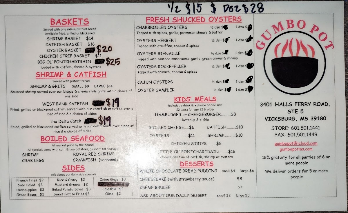 Welcome to Gumbo Pot, a culinary gem nestled in Vicksburg, Mississippi. This inviting restaurant serves up a delightful blend of Creole and Southern flavors that will have you coming back for more. Known for their chicken and sausage gumbo and expertly fried catfish, every dish is a testament to the region's rich culinary heritage.